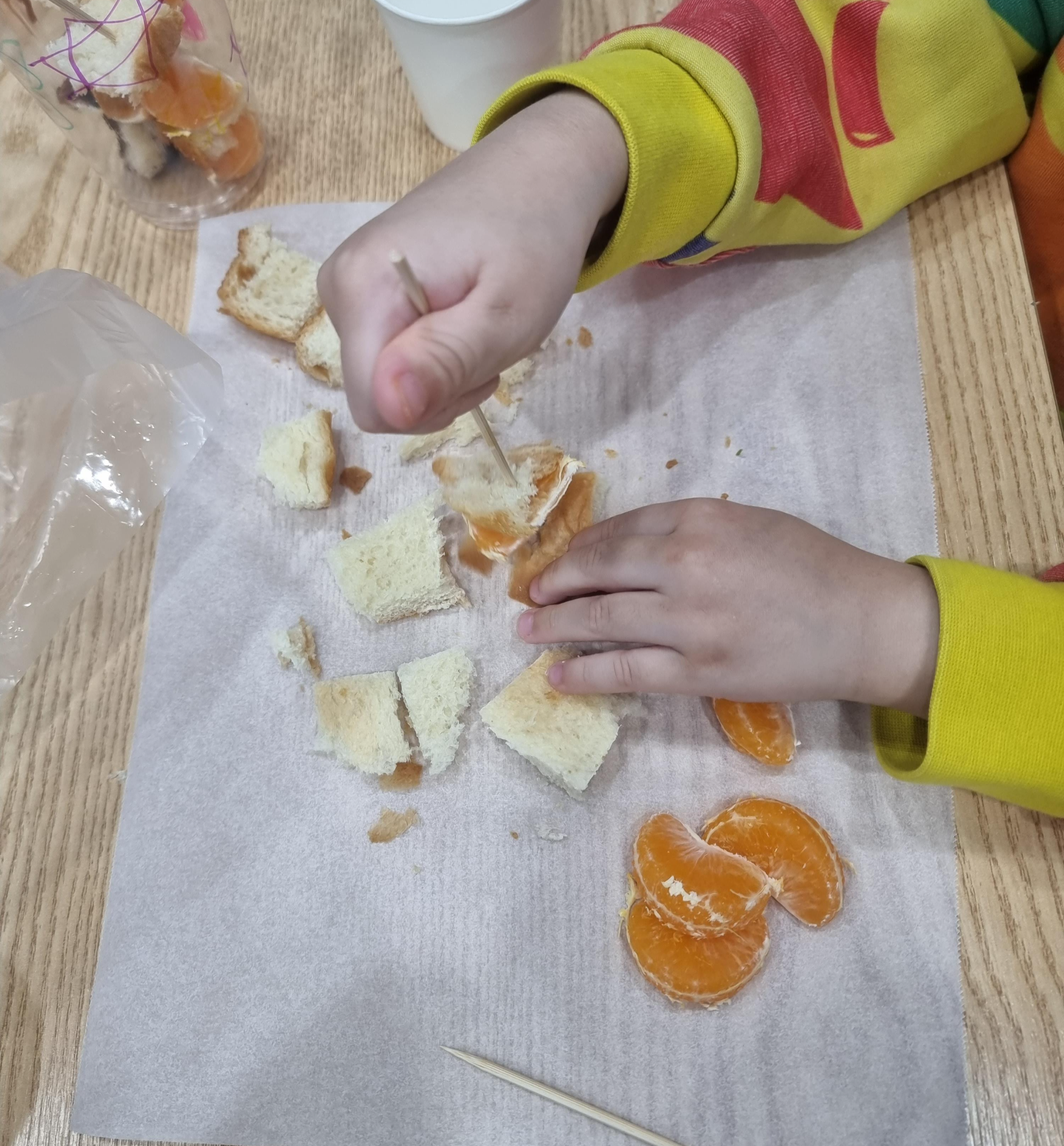 썰어서 준비한 음식은 이렇게 꼬치에 꽂아서 먹기 좋게 만들고 초콜릿을 발라 자기가 준비한 투명 통에 넣기, 꼬치에 꽂을 때도 두 손이 다 움직여야하는데 친구들은 손이 더러워지는 게 싫은지 한 손만 사용하다 답답하고 힘들어서 어느 순간 두 손다 이용해 꼬치에 꽂는 모습이 보였어요. 그렇게 통에 꼬치를 채우고 남은 음식은 입속으로 쏙 넣어주면 끝!