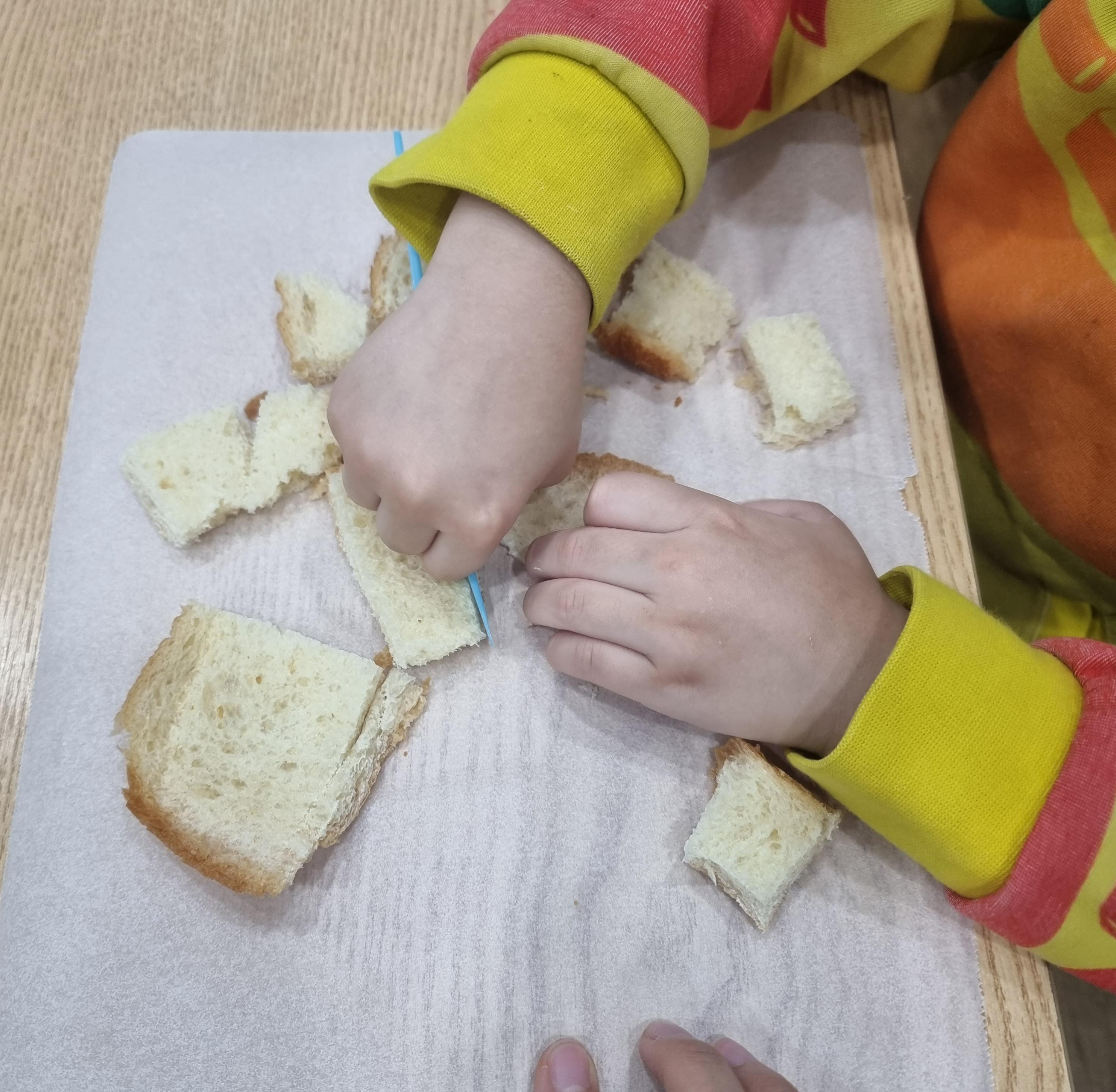 먼저 식빵부터 칼로 자르기를 실시하는데 친구들이 칼을 잡는 방법을 몰라 자르는데 어려움이 있었어요. 그래서 잡는 방법도 알려주고 자르는 모습도 보여주며 실시!