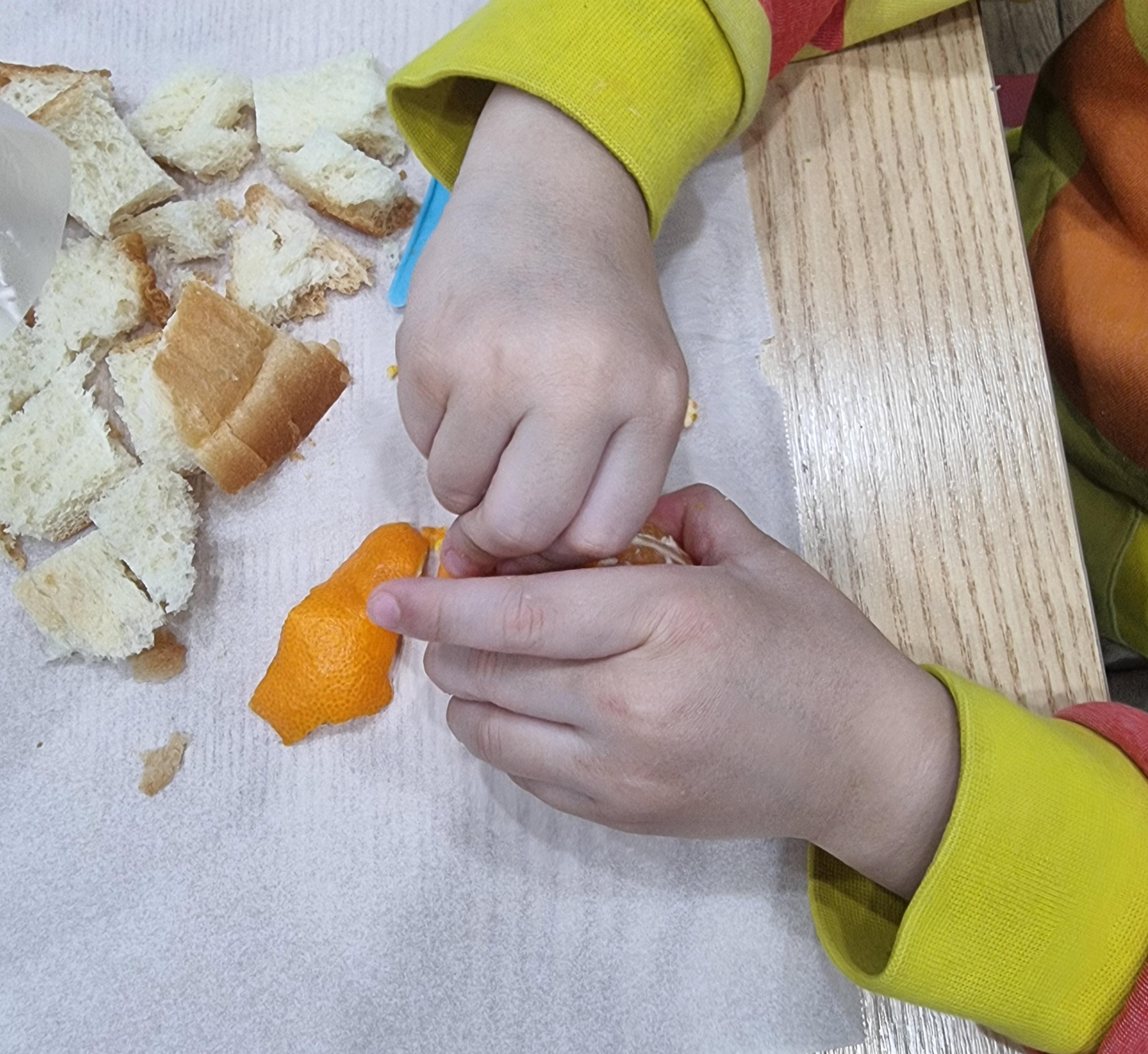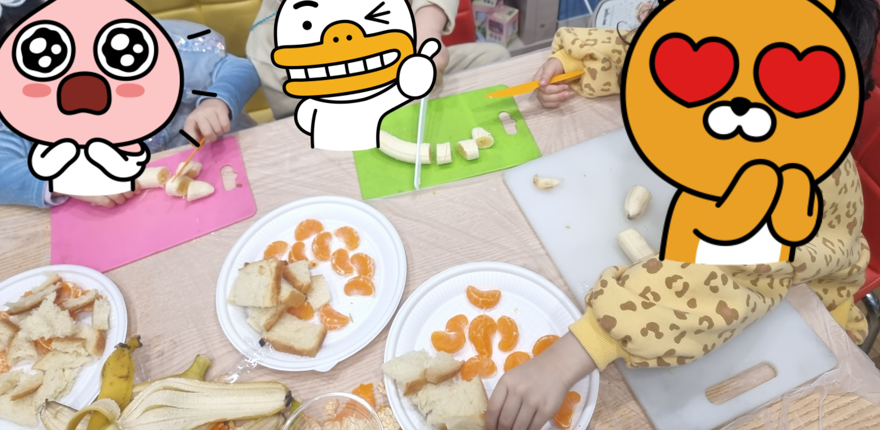 바나나를 칼로 썰어요, 귤의 껍질을 까요, 식빵을 칼로 썰어요